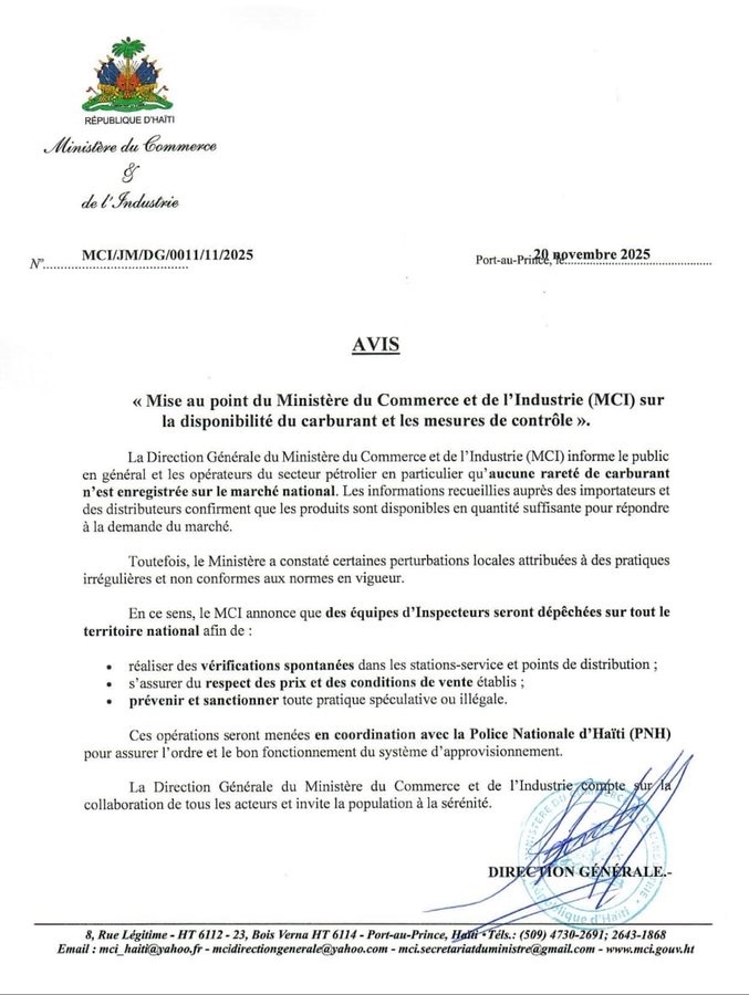 Port-au-Prince – Le ministère du Commerce et de l’Industrie (MCI) a publié ce 20 novembre 2025 une mise au point destinée à répondre aux rumeurs de raréfaction du carburant qui circulent depuis plusieurs jours. Contrairement aux inquiétudes relayées dans plusieurs zones du pays, la Direction générale du MCI affirme qu’aucune pénurie n’a été constatée. Les données recueillies auprès des importateurs et distributeurs montrent, selon l’institution, une disponibilité suffisante pour répondre à la demande nationale.