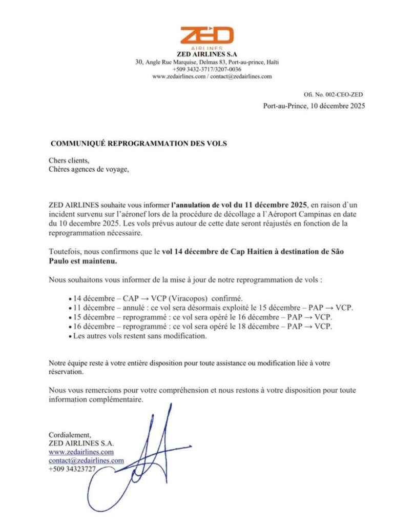 La compagnie ZED Airlines procède à une réorganisation notable de plusieurs liaisons internationales après un incident technique survenu le 10 décembre à l’aéroport de Campinas, au Brésil. L’événement, rapporté dans un communiqué publié depuis Port-au-Prince, a entraîné l’immobilisation temporaire de l’appareil concerné et une cascade de modifications dans le calendrier des vols reliant Haïti au hub brésilien de Viracopos.